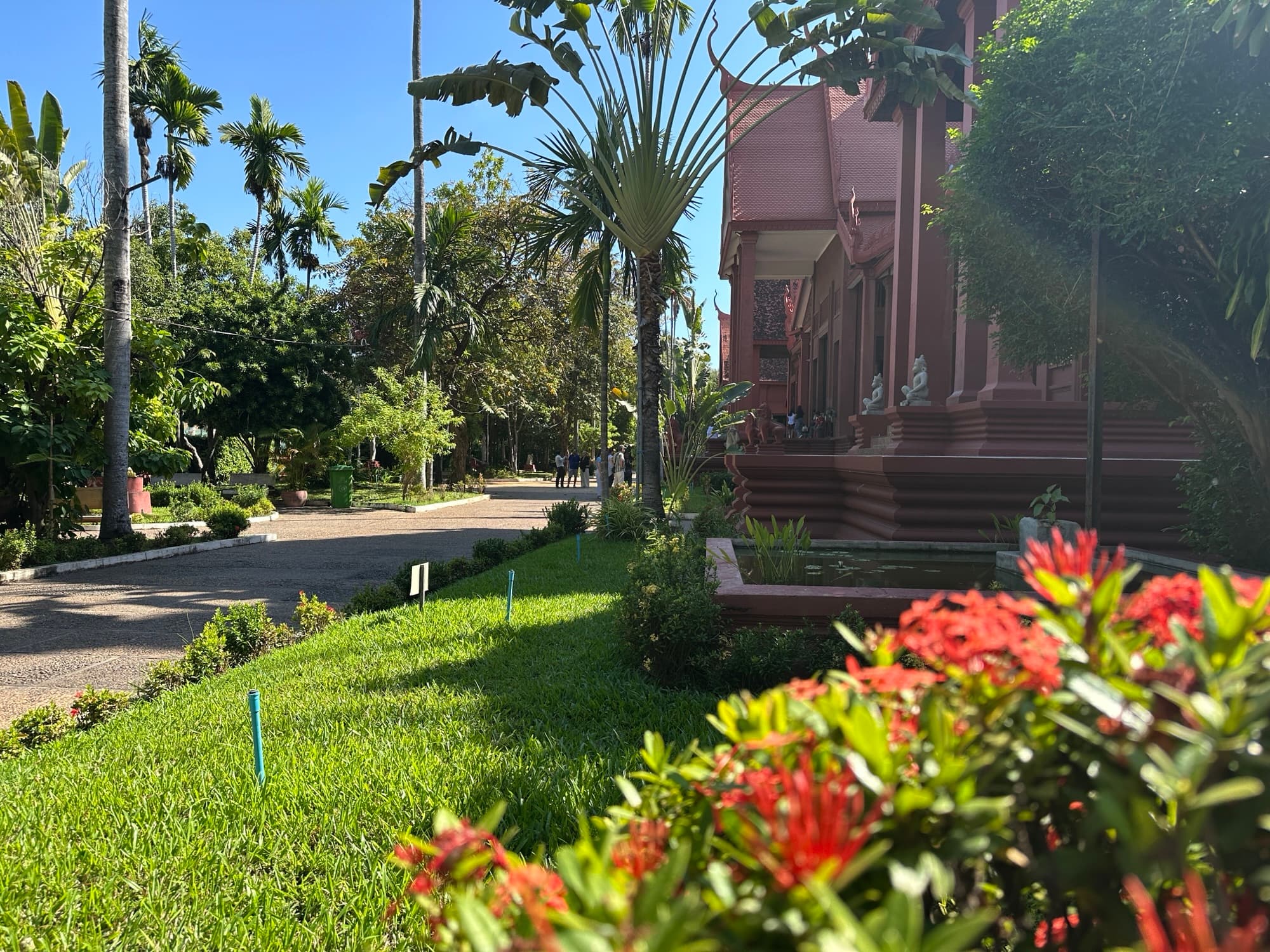 Wir verlassen Wat Phnom mit einem Tuktuk Richtung Royal Palace. Dort geraten wir in einen Schwarm Schulkinder. Unablässig werden wir mit „Hello“ begrüßt. Fleißig zählen sie bis zehn oder schmettern ein „nice to meet you“. Auf der Treppe vor dem Palast stehen sie diszipliniert für ein Foto. So schön hier. Ich lasse mich zu einer zärtlichen Berührung der Lippen von Thomas hinreissen. 50 Kehlen entfleucht ein „Buh“.