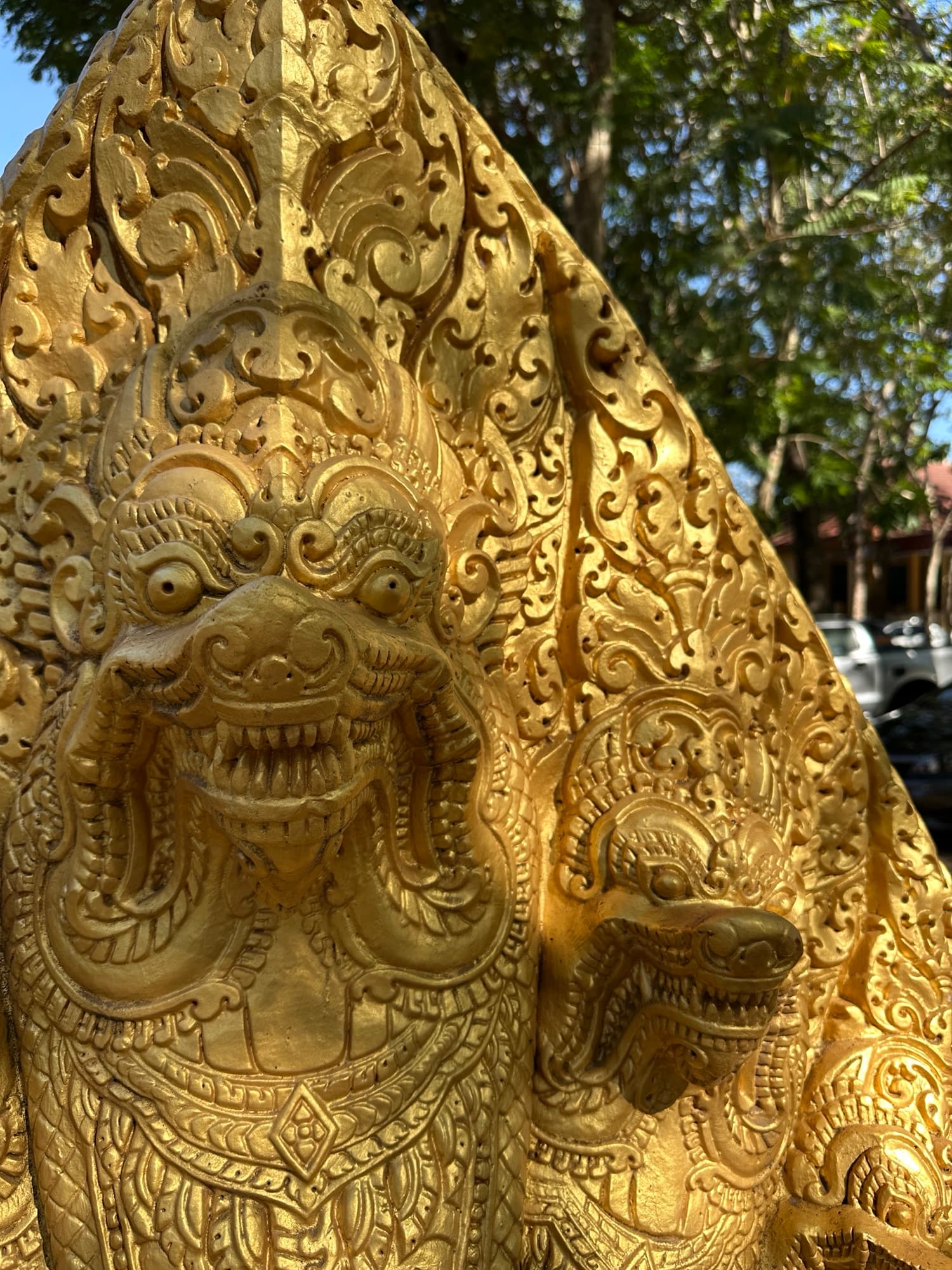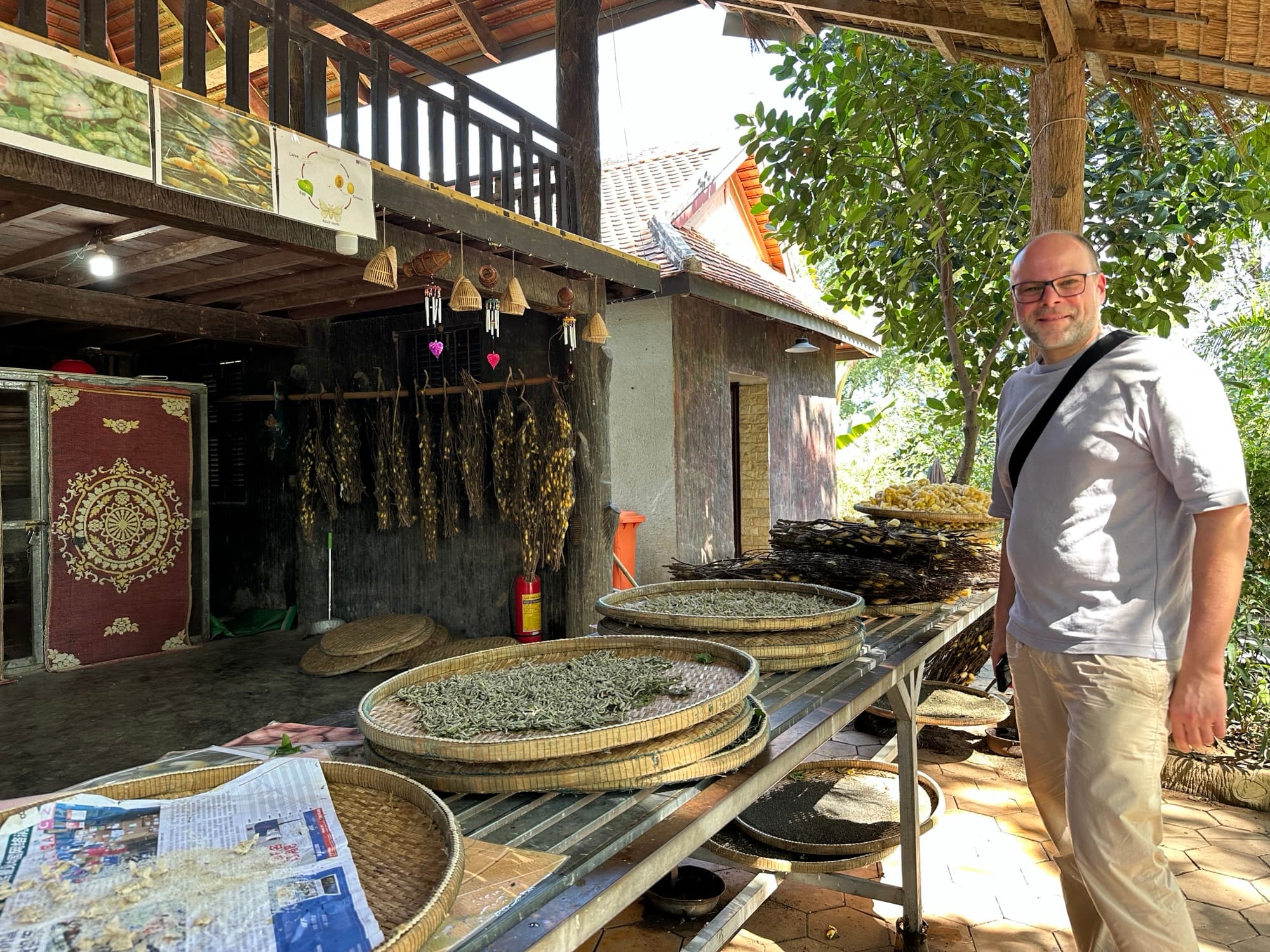 Um die Community zu unterstützen und weil unser Fahrer großartigerweise übersetzen kann, essen wir im Schatten der Bäume direkt an der Tempelanlage. Es gibt keine Speisekarte. Auf dem Handy zeigt uns der Wirt Gerichte. Wir tippen mit dem Finger darauf. Die Speisen die erscheinen, haben eigentlich nichts damit zu tun. Während wir in der Hängematte liegen, bereitet die Familie über Holzfeuer Wildschwein, Hähnchen, Wasserspinat und Fisch zu. 25 Minuten für ein opulentes Menue. Dazu gibt es eine Paste aus Tamarinde und einen Mangosalat. Wieder kann ich einen Punkt auf meiner to-want-Liste abhaken. Du kennst dieses spannende Format noch nicht? Hier die Anleitung.